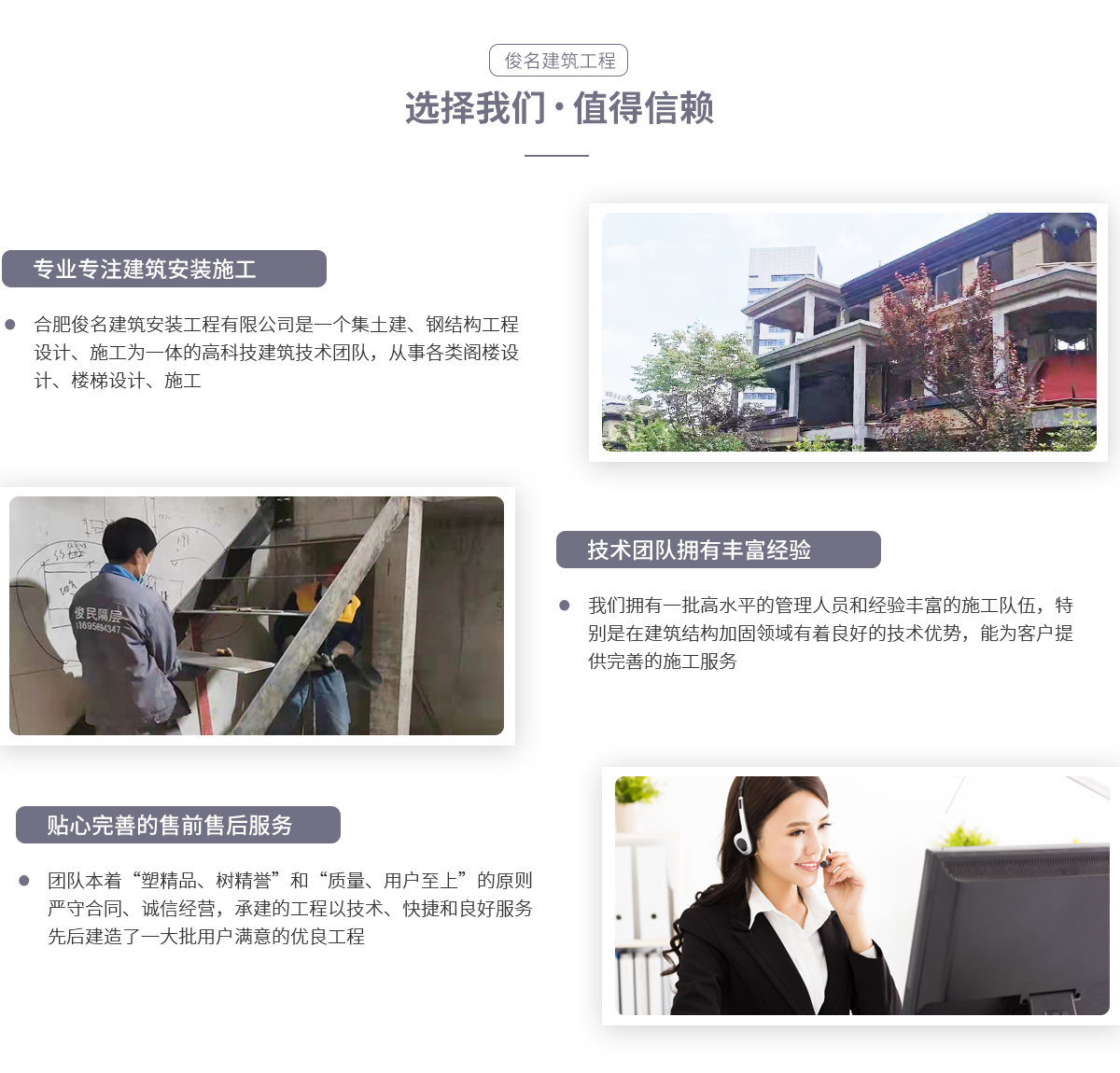 - 合肥俊名建筑安裝工程有限公司是一個集土建、鋼結(jié)構(gòu)工程設(shè)計、施工為一體的高科技建筑技術(shù)團隊,從事各類閣樓設(shè)計、施工。我們擁有一批高水平的管理人員和經(jīng)驗豐富的施工隊伍,特別是在建筑結(jié)構(gòu)加固領(lǐng)域有著良好的技術(shù)優(yōu)勢。團隊員工精誠團結(jié),以“尊重規(guī)范,拒絕平凡”為宗旨,為客戶提供完善的施工服務(wù)。團隊本著“塑精品、樹精譽”和“質(zhì)量、用戶至上”的原則,嚴(yán)守合同、誠信經(jīng)營,所...